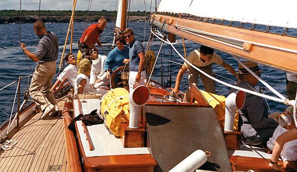 President Kennedy and party sail aboard the U. S. Coast Guard Yacht “Manitou”. Narragansett Bay, Rhode Island. Please credit “Robert Knudsen, White House / John Fitzgerald Kennedy Library, Boston”.